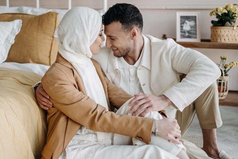 Surah Ar-Rum (30:21) highlights divine signs in marital harmony, fostering emotional and physical connection. The Quran encourages spouses to find comfort and solace in each other, promoting a deep and lasting bond. This perspective, detailed in resources like “Halal Intimacy from the Islamic Perspective,” underscores marriage as a foundation for a righteous society.